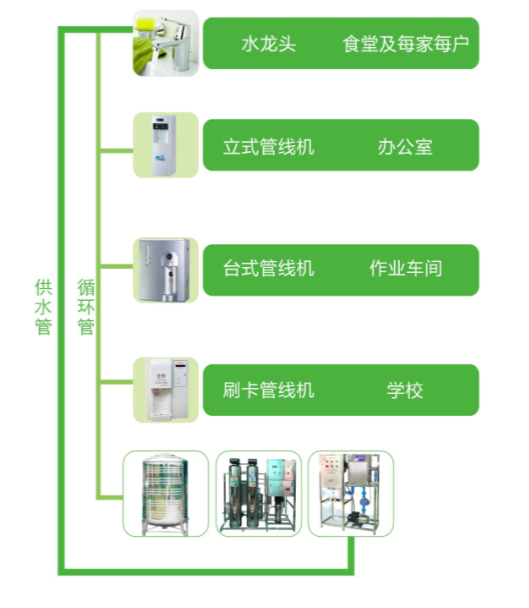 方便:循環管網直接輸送至各個終端,現制現飲,24小時冷熱水供應;